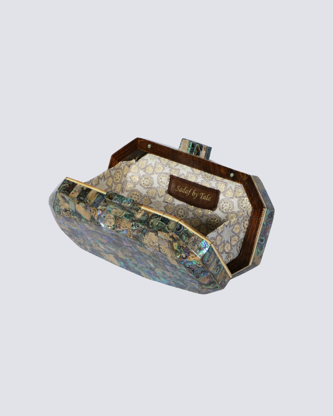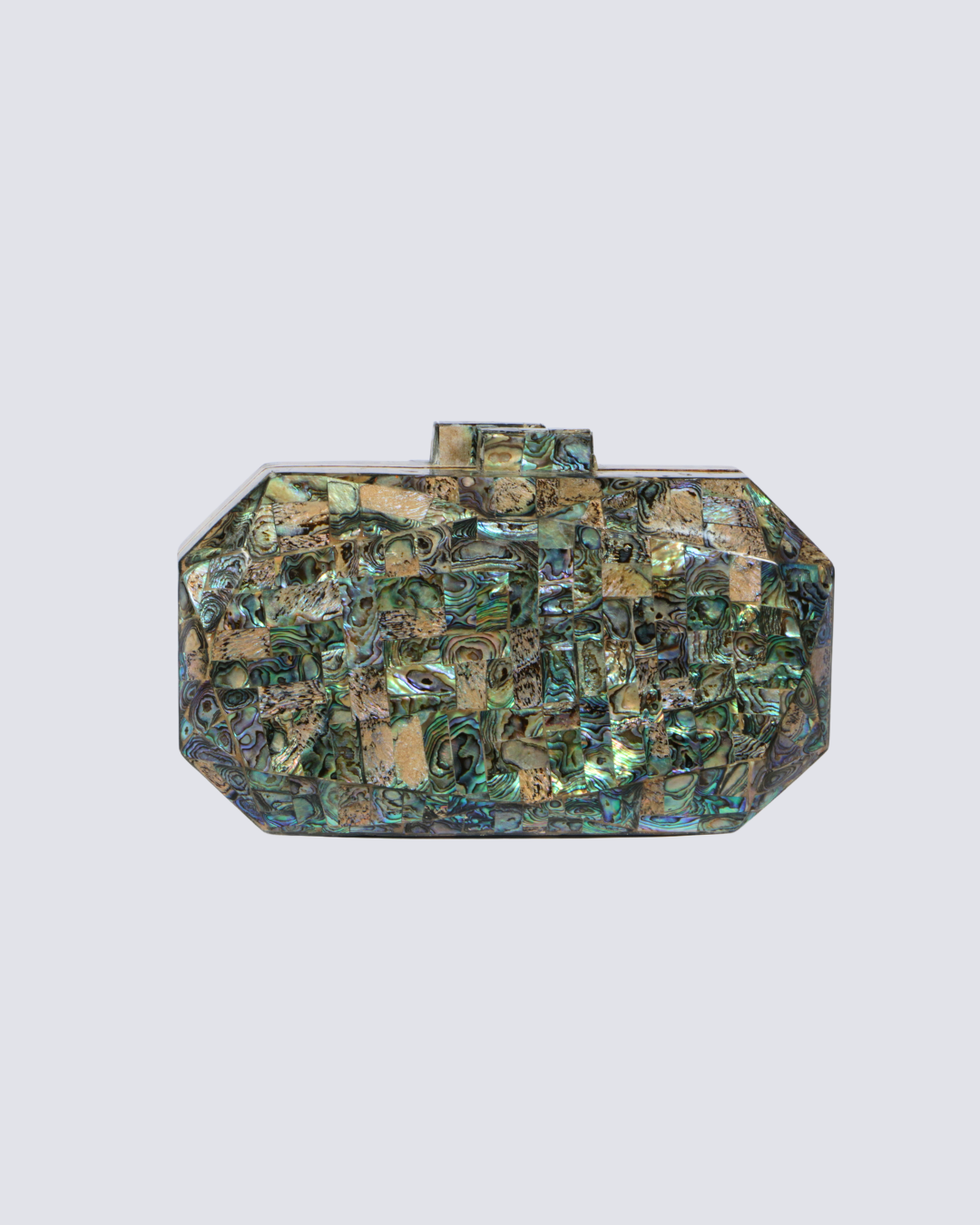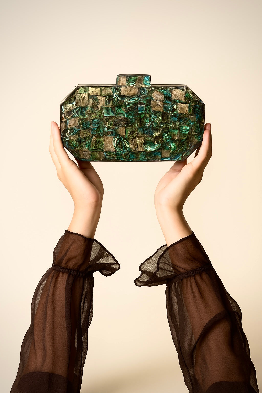 Introducing Green Diamond, a clutch inspired by the vibrant colors of coral in the depths of the ocean. Textured details mimic the delicate forms of coral reefs. The design feels fresh, lively, and full of movement, like a small piece of the sea you can carry with you. Crafted from rich walnut wood and natural seashells, this handmade piece features an interior lined with luxurious brocade fabric.