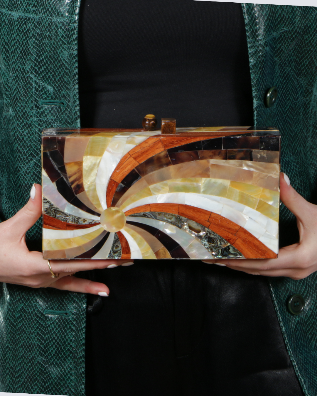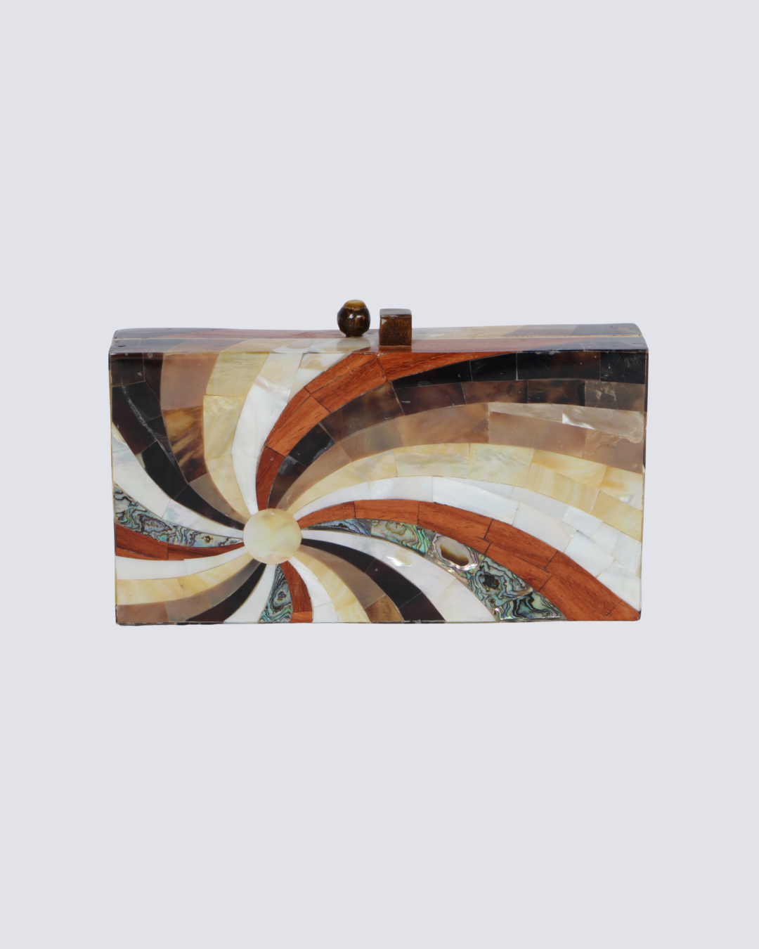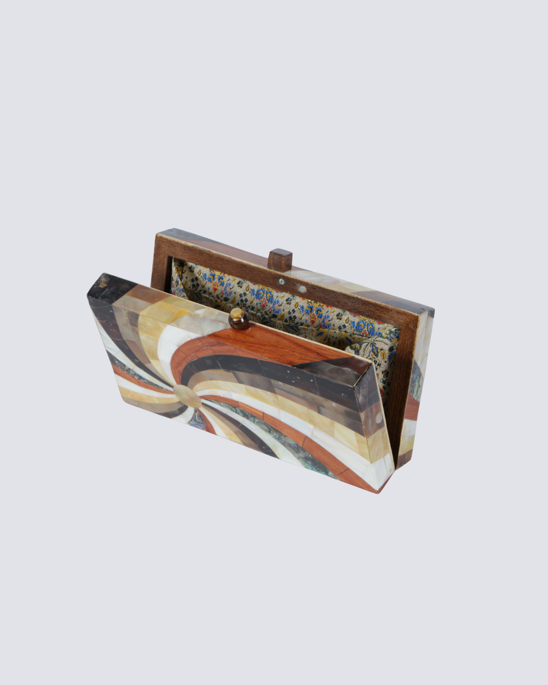 Harness the power of the storm with our Hurricane Clutch. Designed to mimic the force and energy of a hurricane, this clutch features a unique design that will make a statement. Crafted from rich walnut wood and natural seashells, this handmade piece features an interior lined with luxurious brocade fabric.