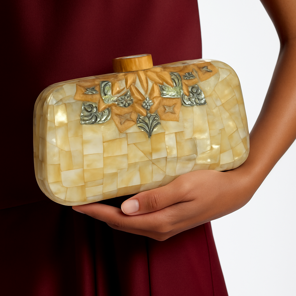 This clutch is inspired by the rocks found in the desert. Its rugged textures and warm, earthy colors reflect the natural beauty shaped by wind and time. Shades of sand, stone, and sunbaked clay give it a grounded, timeless feel, perfect for carrying a piece of the wild landscape with you. Crafted from rich walnut wood and natural seashells, this handmade piece features an interior lined with luxurious brocade fabric.