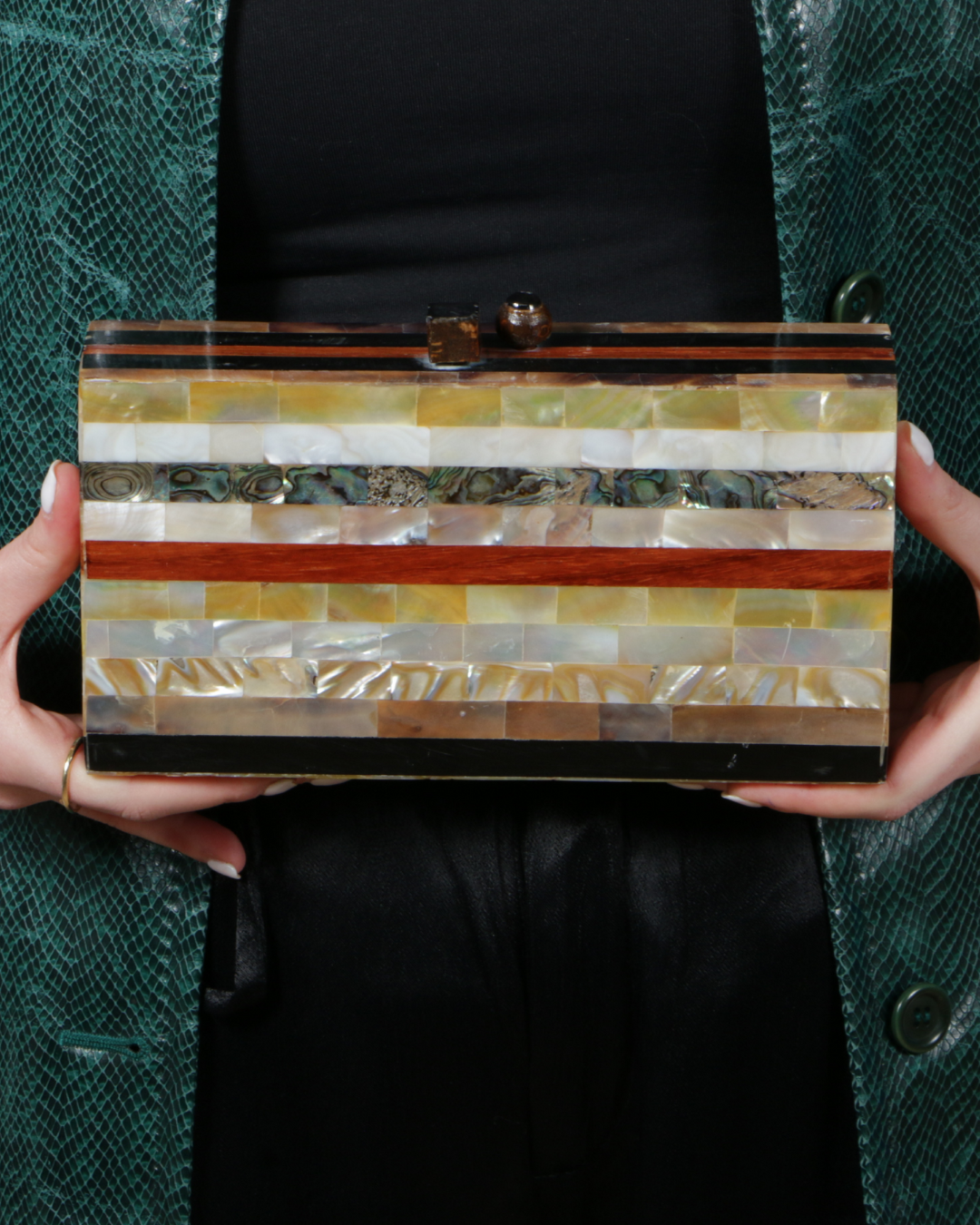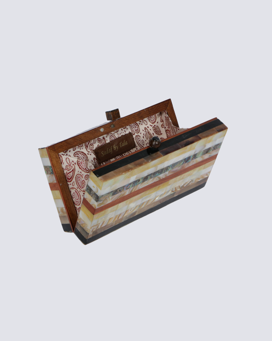 Inspired by the horizon, its unique design is both modern and timeless. Made with high-quality materials, this clutch is the perfect combination of style and functionality. Elevate your look with the Horizon Clutch. Crafted from rich walnut wood and natural seashells, this handmade piece features an interior lined with luxurious brocade fabric.