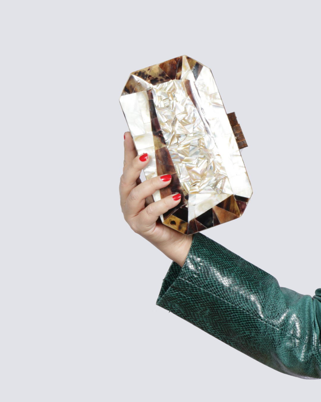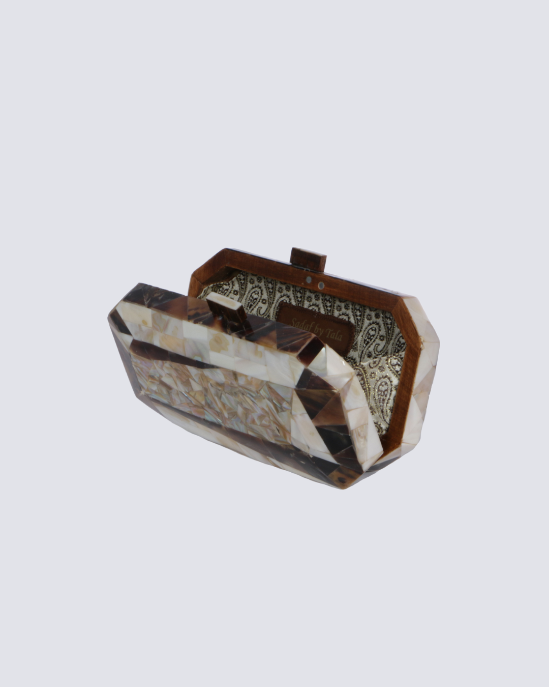 The brown and white diamond clutch from the Diamond Collection is inspired by the Earth's raw interior. With rich brown tones and sparkling white diamond accents, it reflects the natural contrast and beauty formed deep beneath the surface. Crafted from rich walnut wood and natural seashells, this handmade piece features an interior lined with luxurious brocade fabric.